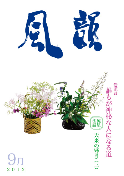 | 風韻誌 2012年9月号 巻頭言 「誰もが神秘な人になる道」 流星法話 「天来の響き(三)」 「生命の教育」 尾崎晃久 「祈り心が未来を開く」 木村純子 「公のために生きる」 T・M 五井先生のお写真上映会 特別行事法話 「自己の本心の世界を現していく」 高知集会、倉吉・松江の合同集会 |