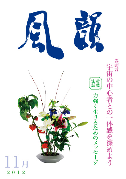 | 風韻誌 2012年11月号 巻頭言 「宇宙の中心者との一体感を深めよう」 黄葉法話 「力強く生きるためのメッセージ」 「五井先生の統一行」 尾崎晃久 「無限大を生きる道」 木村純子 特別行事法話 「人類の意識を飛躍させよう」 体験談・「主人の病気を通して」 「一歩、一歩」 「私にはこの道しかない」 |