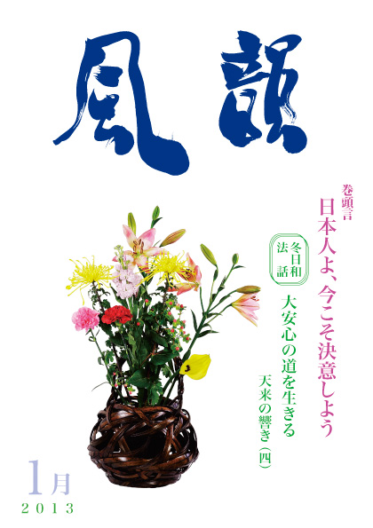 | 風韻誌 2013年1月号 巻頭言 「日本人よ、今こそ決意しよう」 冬日和法話 「大安心の道を生きる 天来の響き(四)」 「就寝前の統一」 尾崎晃久 「個人相談を受けて」 木村純子 芦屋スライド講演会 体験談・「信じていけば道は開かれる」 「事務局のお手伝いを通して」 |