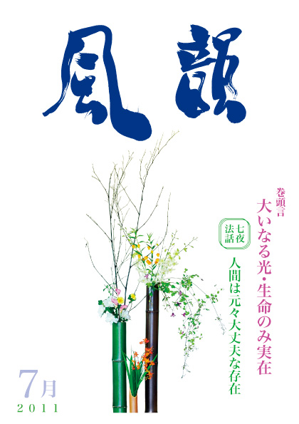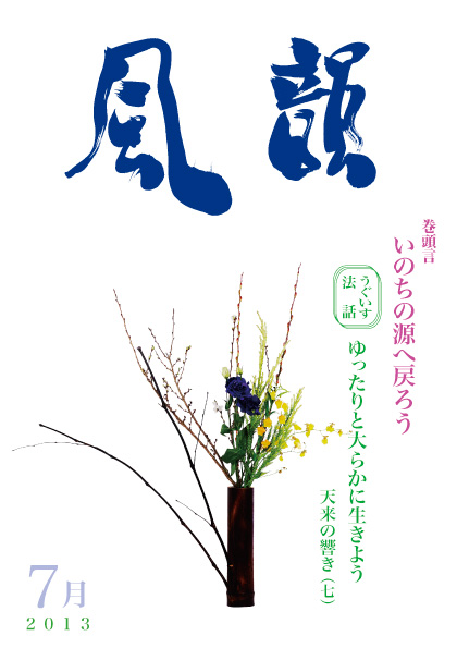 | 風韻誌 2013年7月号 巻頭言 「いのちの源へ戻ろう」 うぐいす法話 「ゆったりと大らかに生きよう 天来の響き(七)」 堺法話会より「祈りの世界は安楽の道」 「日本国憲法と世界平和の祈り」 尾崎晃久 「答えはここに」 木村純子 読者の体験談 祈りの特別行事報告 |