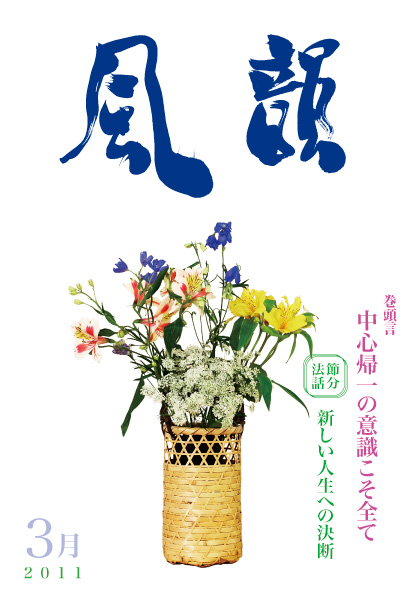 | 風韻誌 2011年3月号 巻頭言 「中心帰一の意識こそ全て」 節分法話 「新しい人生への決断」 コスモス問答 「中高年の再就職について」 「ストレスについて」「病気の問題について」 「西宮勉強会 空即是色の生き方」 尾崎晃久 詩「淡雪」 Y・N 読者の広場・「奇跡の一瞬」(K・T) 「価値ある生き方」(S・E) etc |