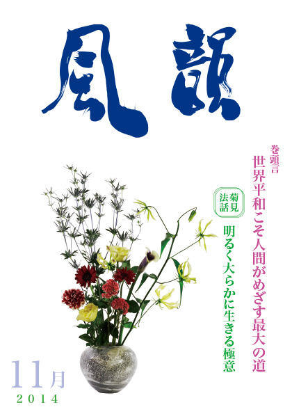 | 風韻誌 2014年11月号 巻頭言 「世界平和こそ人間がめざす最大の道」 菊見法話 「明るく大らかに生きる極意」 「言葉の大切さ」 尾崎晃久 「消えてゆく姿で全てが光る」 木村純子 「モネと浮世絵」 S・E 読者の体験談 |