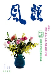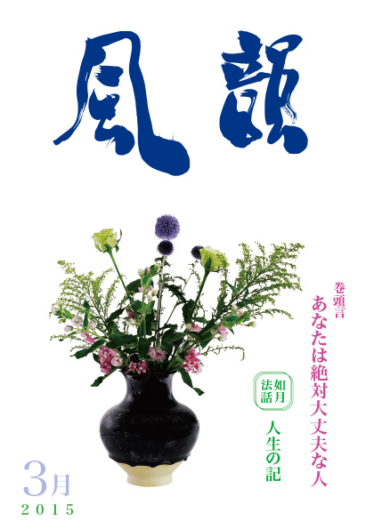 | 風韻誌 2015年3月号 巻頭言 「あなたは絶対大丈夫な人」 如月法話 「人生の記」 「日本人の心に平和の祈りを」 尾崎晃久 「一番大きな良いこと」 木村純子 京都集会だより 読者の体験談 etc. |