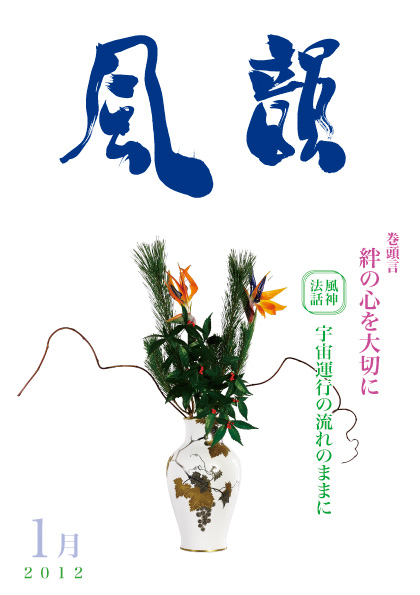 | 風韻誌 2012年1月号 巻頭言 「絆の心を大切に」 風神法話 「宇宙運行の流れのままに」 「特別行事での法話」 「神様の生命が真実の自分」 尾崎晃久 「全てを生かす祈りの響き」 木村純子 芦屋ギャラリー開催報告 体験談・「大丈夫・大丈夫」 「再就職できました」 etc |