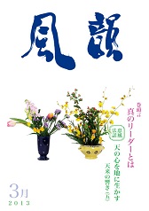 | 風韻誌 2013年3月号 巻頭言 「真のリーダーとは」 恵風法話 「天の心を地に生かす 天来の響き(五)」 「各界の著名人の五井先生評」 尾崎晃久 「永遠の天命」 木村純子 新年祝賀法話会 体験談・「いつも守護霊様に守られている」 「伯父の他界を通して」 |